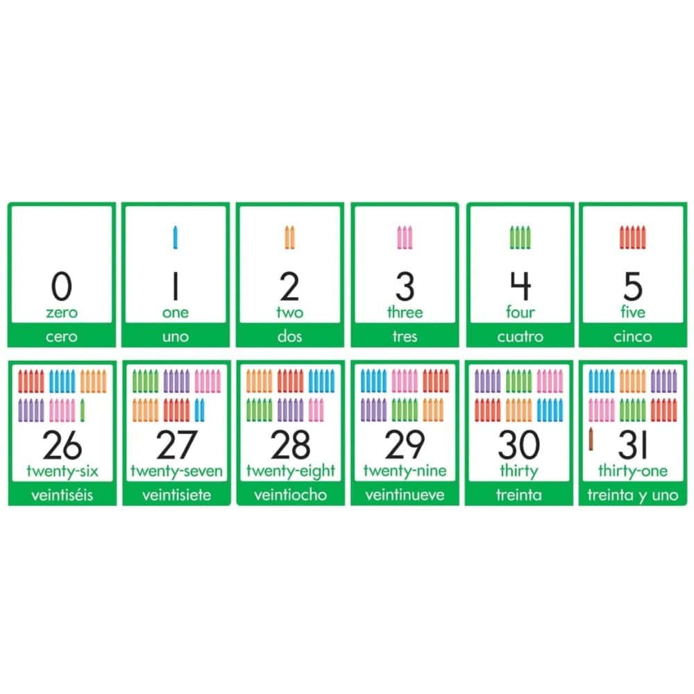 This packs of colourful crayons make it easy to learn numbers 0-31. Number words in English and Spanish extend learning opportunities. Cards are 6½ inches x 7½ inches each.