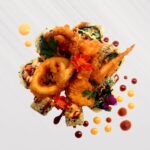 • Fried Calamari wrapped with cucumbers, carrots, avocado, chive and red cabbage.