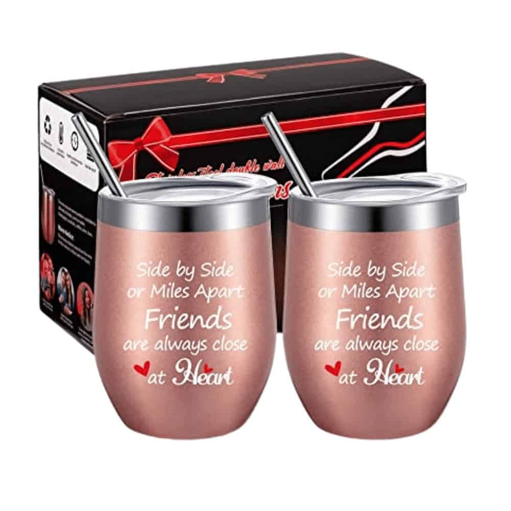 •  2 piece (rose gold) friend wine tumblers with BPA-free lids, 2 pieces stainless steel straws and 2 pieces straw cleaning brushes in our customized elegant gift box, A great novelty present idea for long distance friendship, graduation, moving away, going away, thank you, Christmas, white elephant gift exchange, stocking stuffer, wedding, anniversary.