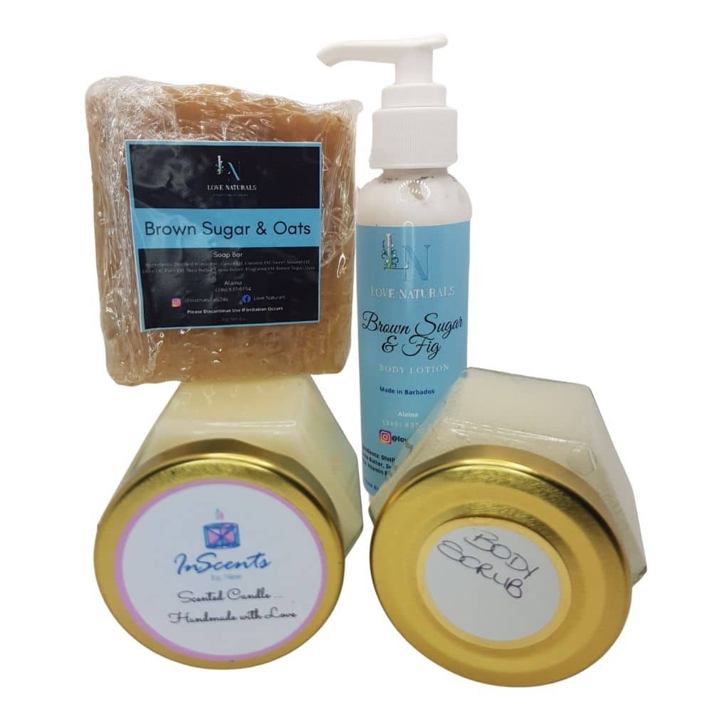 The package is a natural soap, body lotion, body scrub and a scented candle.