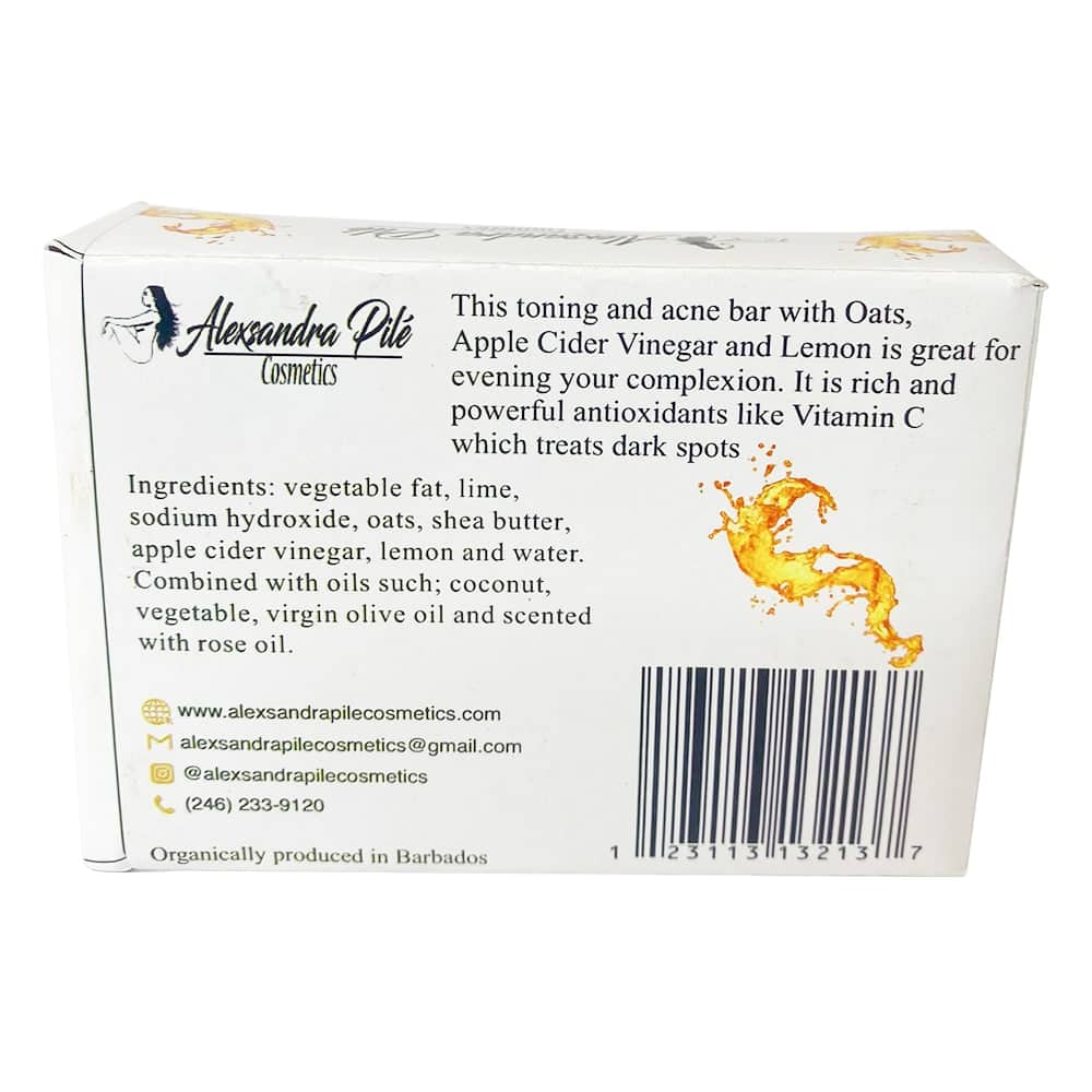 - This toning and acne bar with oats, apple cider vinegar and lemon is great for evening your complexion.