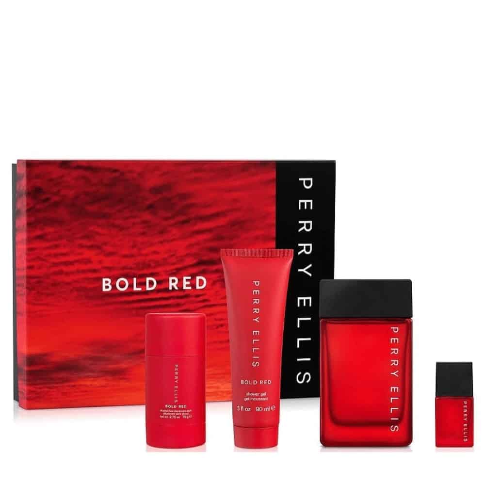 • Rich, exotic hints of precious mahogany wood and tonka bean blend with warm musk forming a captivating, long-lasting trail of intrigue, comfort and sensuality. 3.4 OZ SPRAY + DEO STICK + SH GEL + MINI. Perry Ellis Men’s Bold Red Gift Set