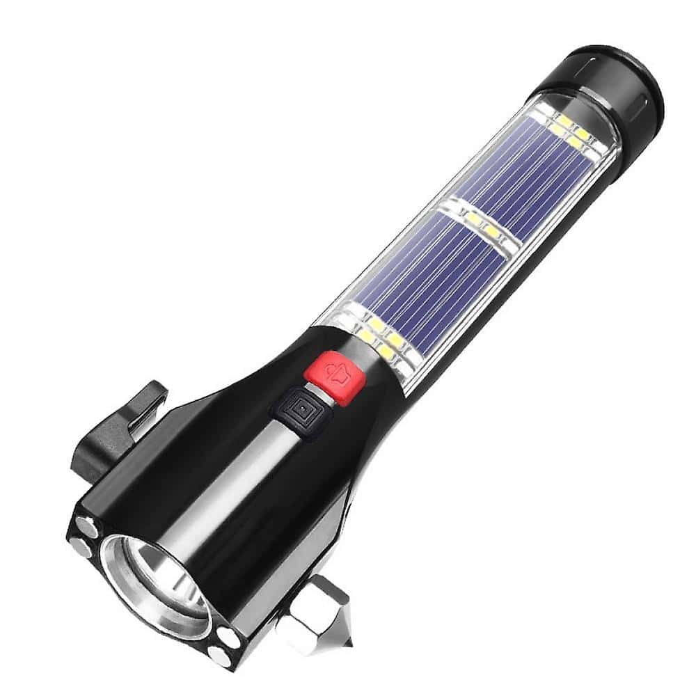 - Solar LED Car Flashlight features: red light alarm function, distress horn, seat belt cutter, window breaker, magnet, USB port, mobile device charging support, solar charging board.