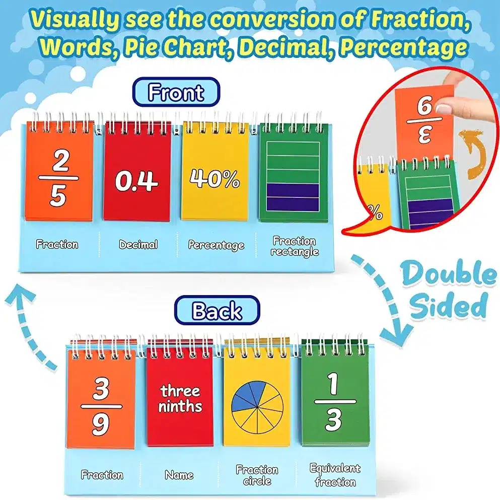 - Double-sided Flip Charts-One side shows how to convert fractions into decimals and percentages, and children can also see the relationships between fractional parts of the same whole.